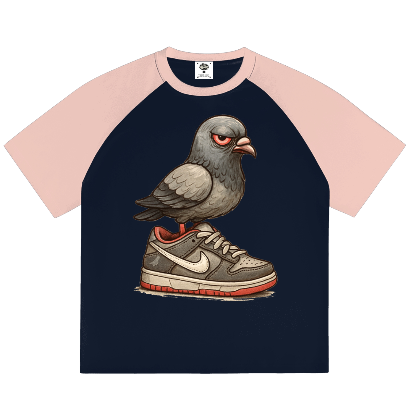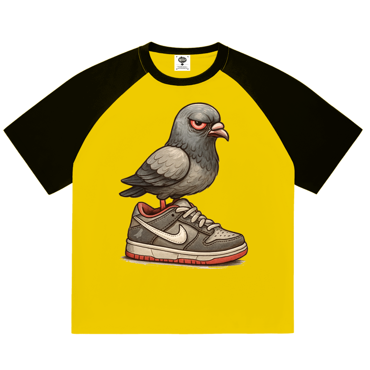Featuring a color-blocked raglan sleeve design, the shirt carries a vintage sports aesthetic that adds contrast and visual energy to the overall look. The dynamic “Dunk The Angry Pigeon” graphic brings character and storytelling to the piece, turning a simple tee into a conversation-starting statement rooted in urban culture.
